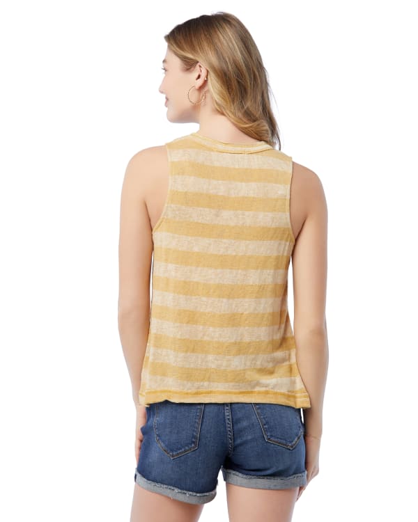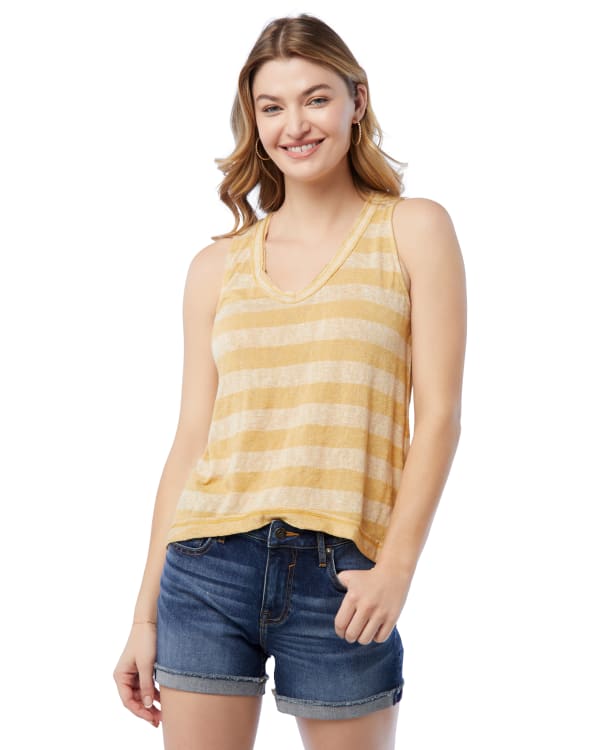 An ultra-soft update on a versatile classic. This versatile striped tank has a v-neck and a breezy relaxed fit with a subtle dip hem. Great layered over with a denim jacket or left to shine on its own with some cut-off high-rise denim. Order it now, get free shipping and you'll feel beautiful every time you wear it. 59% rayon, 36% polyester, 5% spandex, machine wash cold.