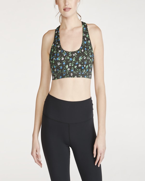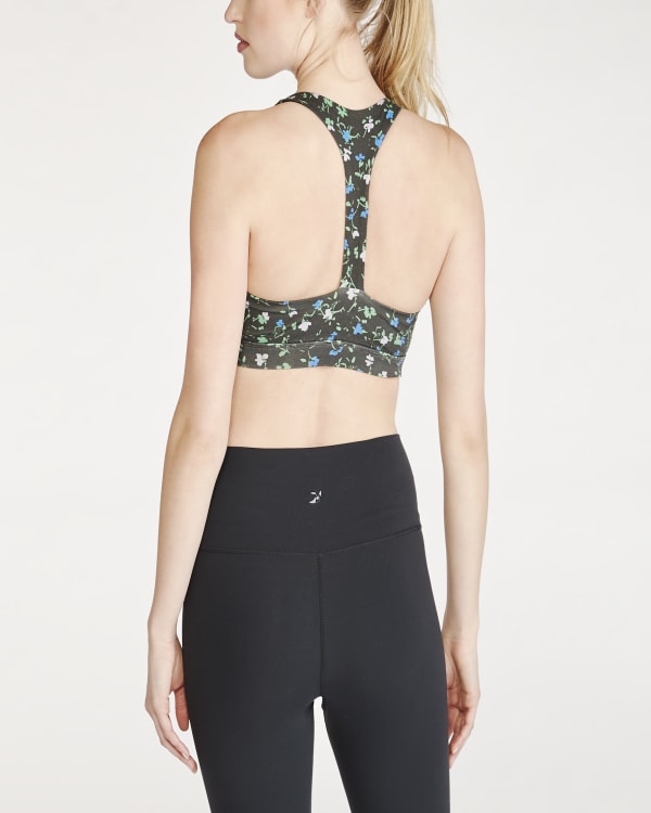 Designed in the U.S.A, this on-trend sports bra is designed to withstand all of your fitness practices. It features an ultra-supportive underbust band, racerback design, and removable cups.
