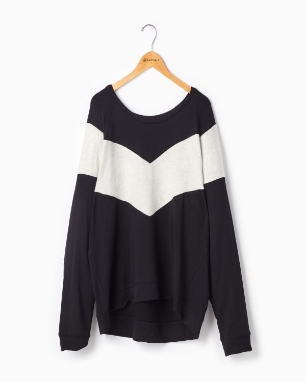 This cozy colorblock top will give your ensemble the on-trend update it craves! Relaxed fit with an eye-catching chevron and a so-soft fleece lining. Made in the USA.
