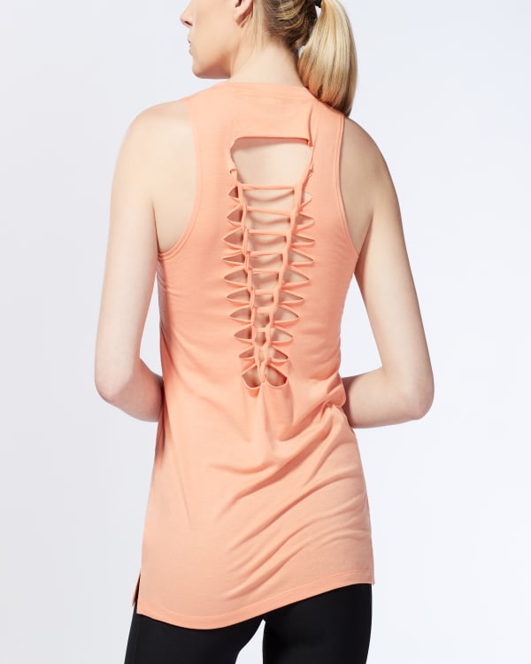 Step up your activewear game in this soft, upgraded tank. Its basic crew neck front is contrasted with beautiful, braided slash-back detailing.