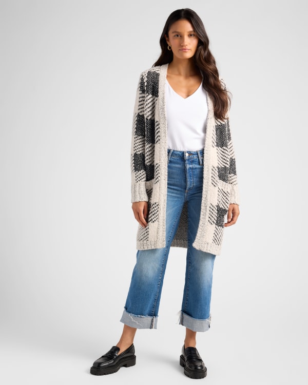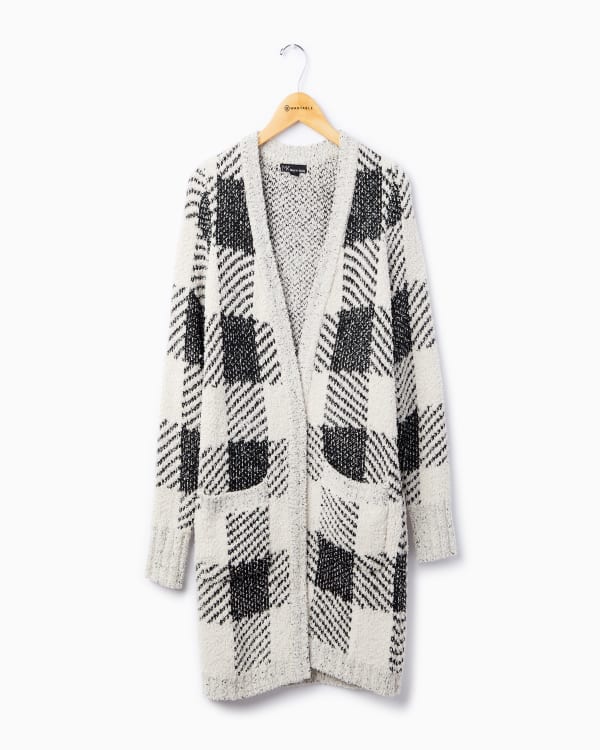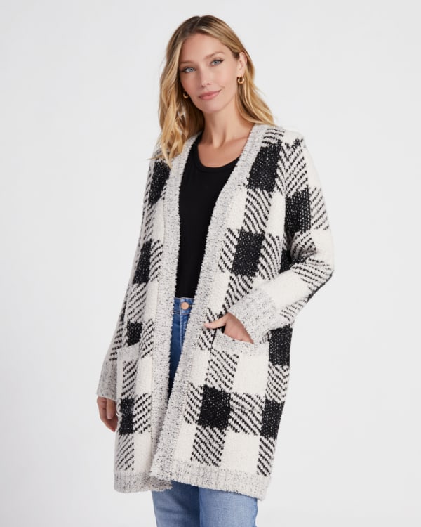 An open-front cardigan that goes everywhere with you! Relaxed fit and mid-thigh length with two handy front pockets. Made of a fuzzy, medium-weight chenille with a bold gingham print – grab it for the office or the cabin.