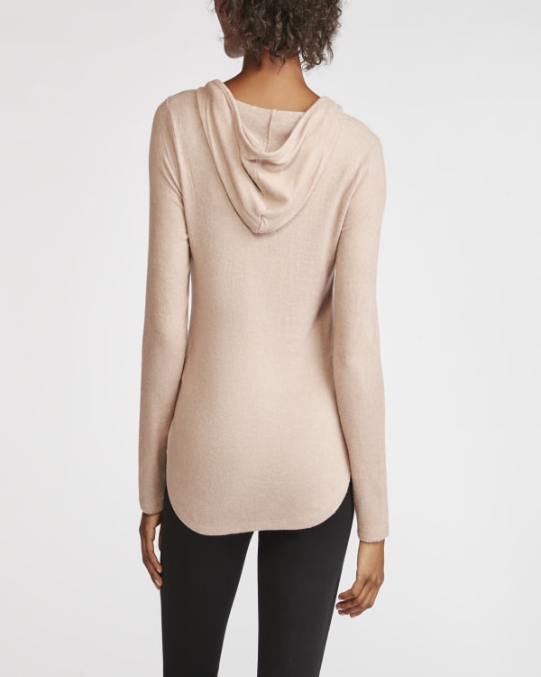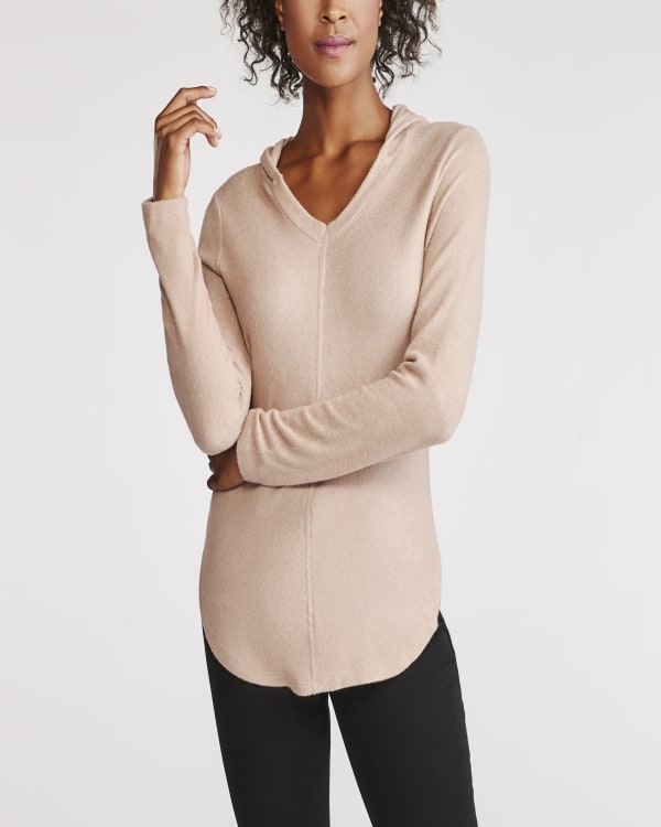 Made from a luxuriously soft brushed fabric, this cozy hoodie blends the best of both style and comfort. Featured in an on-trend shade and detailed with a v-neckline and center seam.