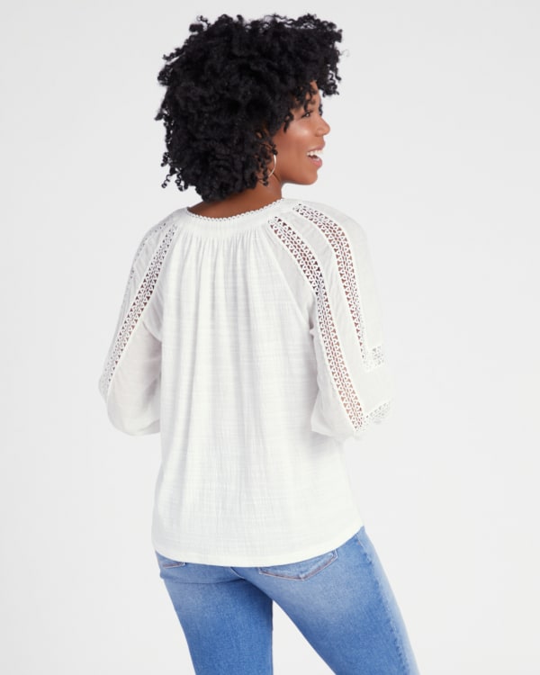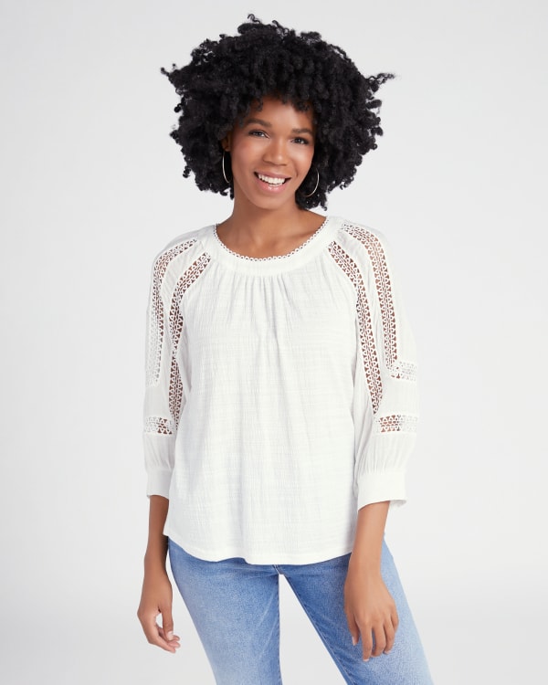 This boho blouse will win you all the compliments at work! Relaxed fit with eye-catching lace details, flattering 3/4 sleeves, and a boat neck. Made of breathable 100% rayon knit.