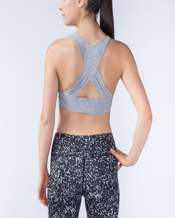This fitted, slightly compressive sports bra features 4-way stretch fabrication with moisture-wicking properties and provides full coverage for medium-impact workouts. The sporty racerback splits into smaller straps for a supportive design. Removable cups included.