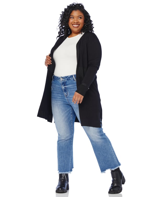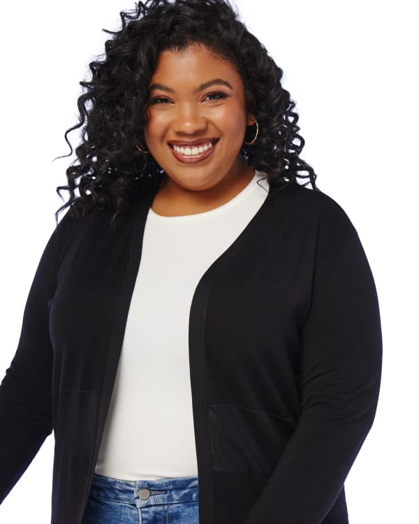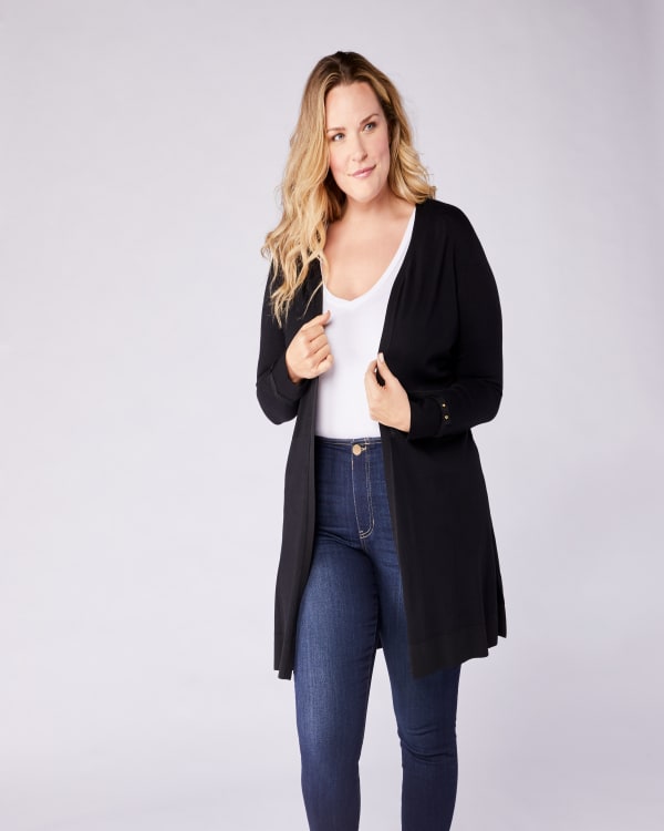 This dressy cardigan is perfect for work! In a relaxed fit with a breezy open front, flattering elasticated waist, and gorgeous studded sleeves. Made of a lightweight knit that keeps your breathing.