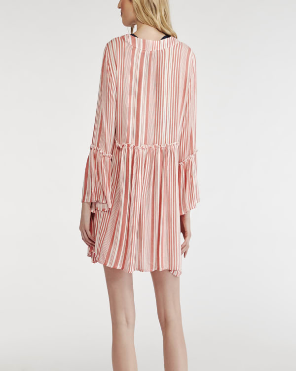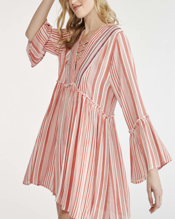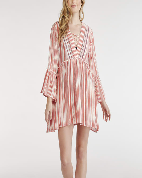 Cover up in style this resort season. This fun and feminine embroidered tunic adds some color and vibrancy to your look. Details include a flattering lace-up neckline, cinched waist, and a flare sleeve.