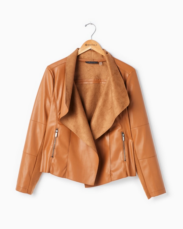 Wearing this smooth faux leather jacket will instantly make it a special day! Relaxed fit with a gorgeous open waterfall drape front, and two zippered pockets. Ultra-soft and cozy inside and out.