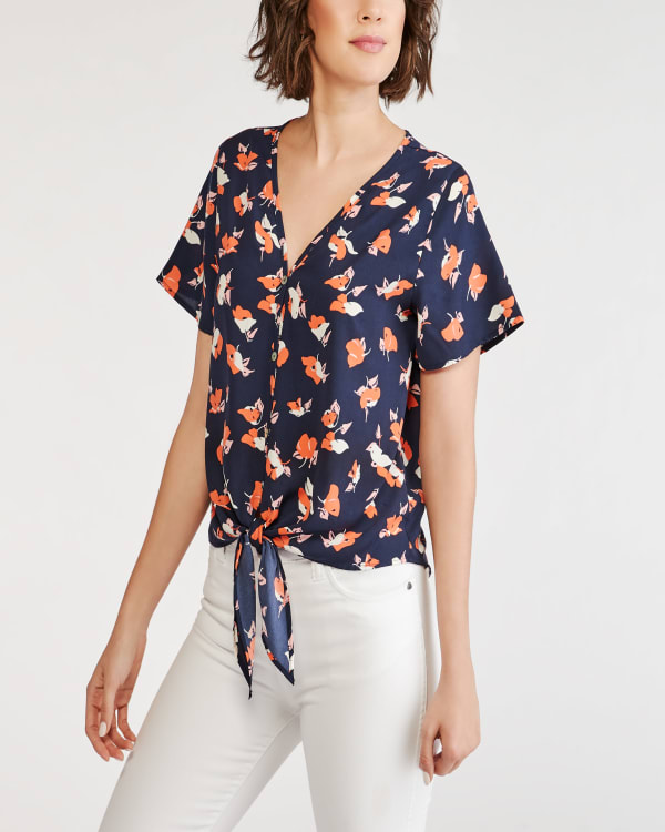 Decorated in a bold botanical print, this short-sleeve blouse features a row of buttons and tie along the hem. Pair it with your go-to blue jeans or try it with a pair of trousers.