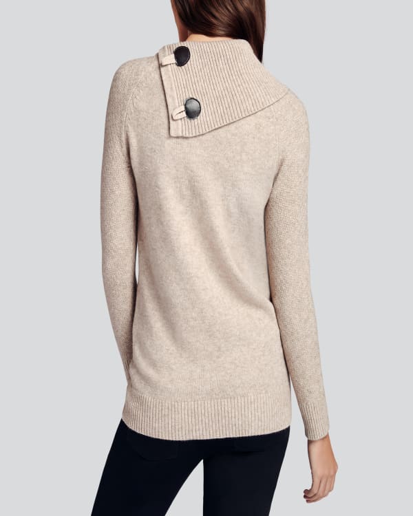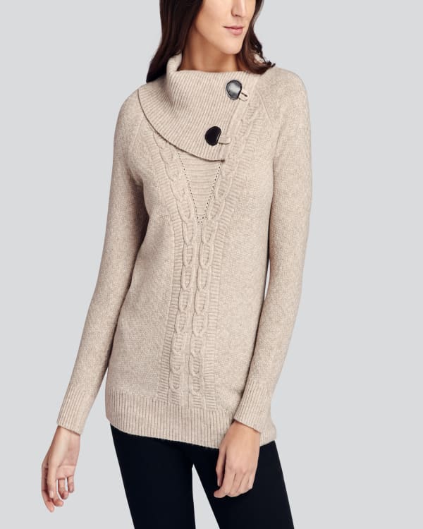 This long sleeve sweater features a cable knit detailing across the front and toggle accents along the fold-over neckline. Slightly fitted, it's a polished piece that can even dress up a pair of leggings. Our expert personal stylists know you’ll look great in it – that’s why we’ll ship it to you for free. 50 % viscose, 27% polyester, 23% nylon.
