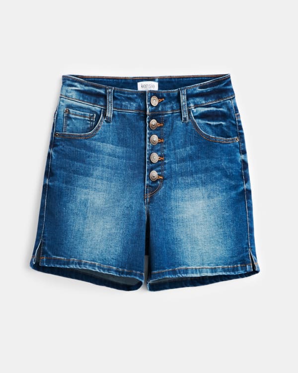 With an ultra-flattering high rise and on-trend exposed button fly, these denim shorts are an instant warm-weather staple. Finished with a classic medium wash with whiskering and fading for added versatility. (Inseam: 4")
