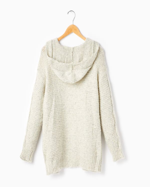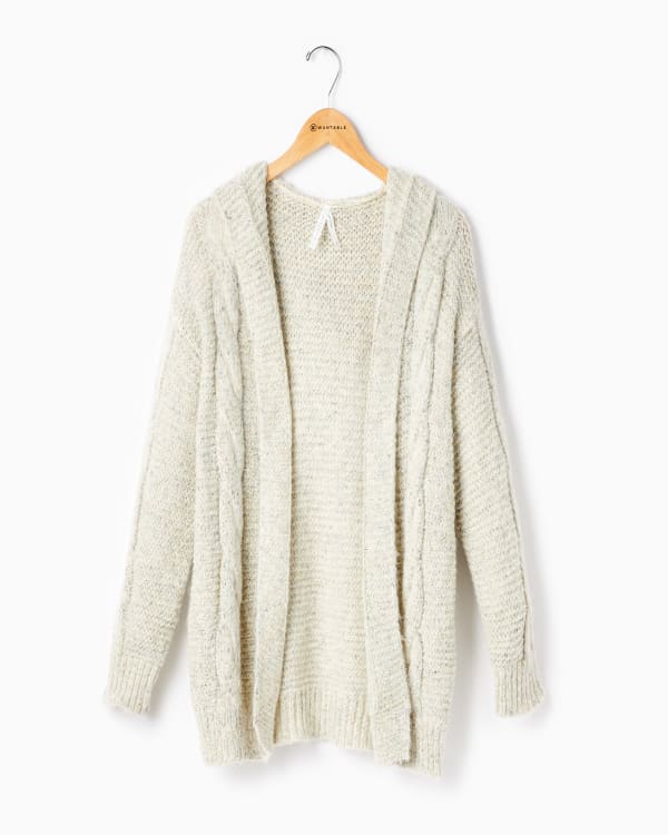 Here's the cardigan that feels softer than a dream! This cozy hooded sweater has a relaxed open-front style and is made of a featherlight chunky knit that feels so soft to the touch. It goes well with beige pants and loafers.