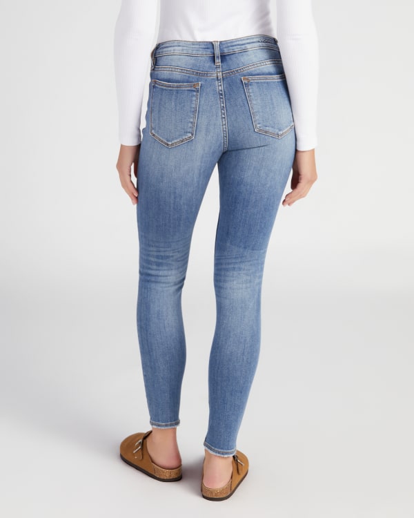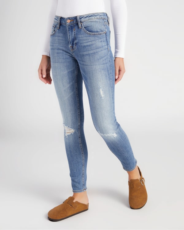 These mid-rise skinny jeans offer a laid-back weekend vibe. Complete your look with a pair of white sneakers and a cozy checkered cardigan.