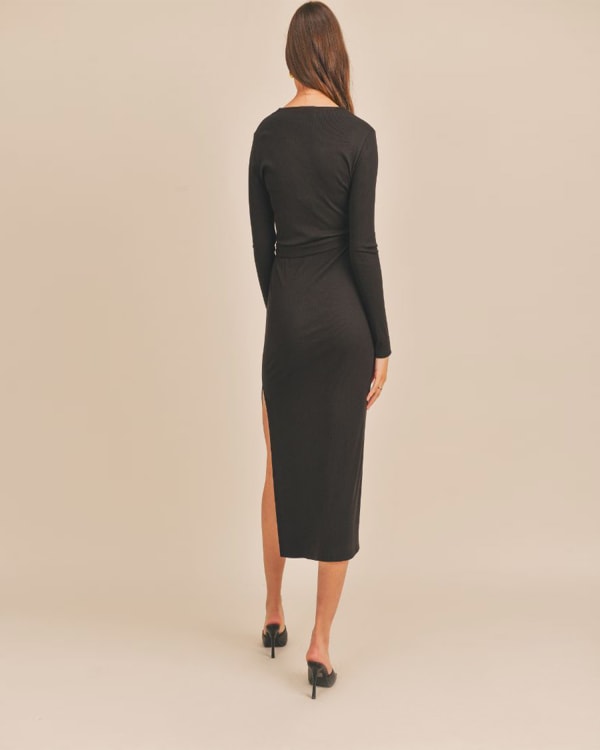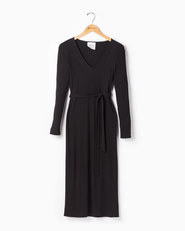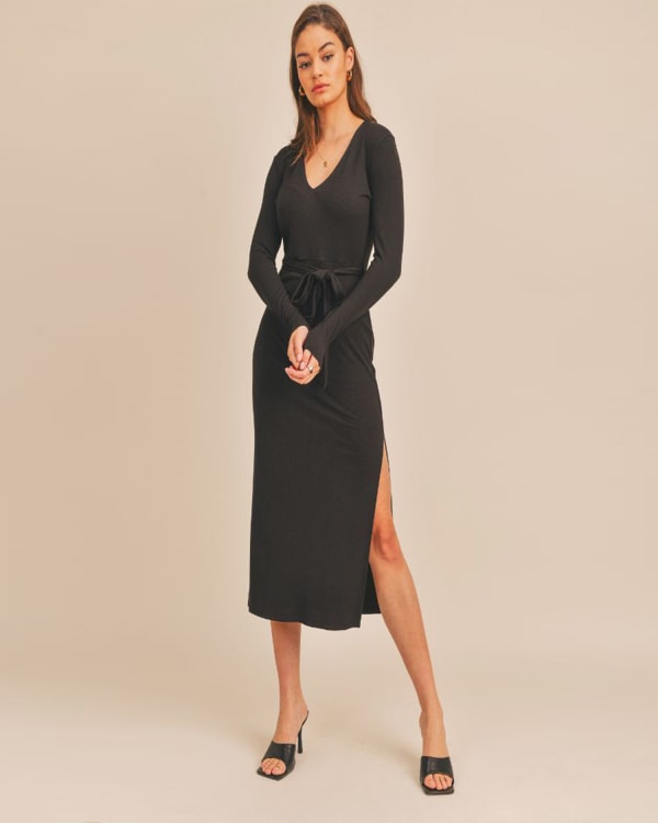 This cozy bodycon dress will look irresistible on you! Featuring thin ribbed fabric that is soft and stretchy to touch, a v-neck, belted waist, body-skimming fit and a fabulous side slit. Pairs wonderfully with a statement necklace. Our expert personal stylists know you'll look great in it— that's why we'll ship it to you for free. 85% rayon, 15% spandex, made in the USA, hand wash cold.