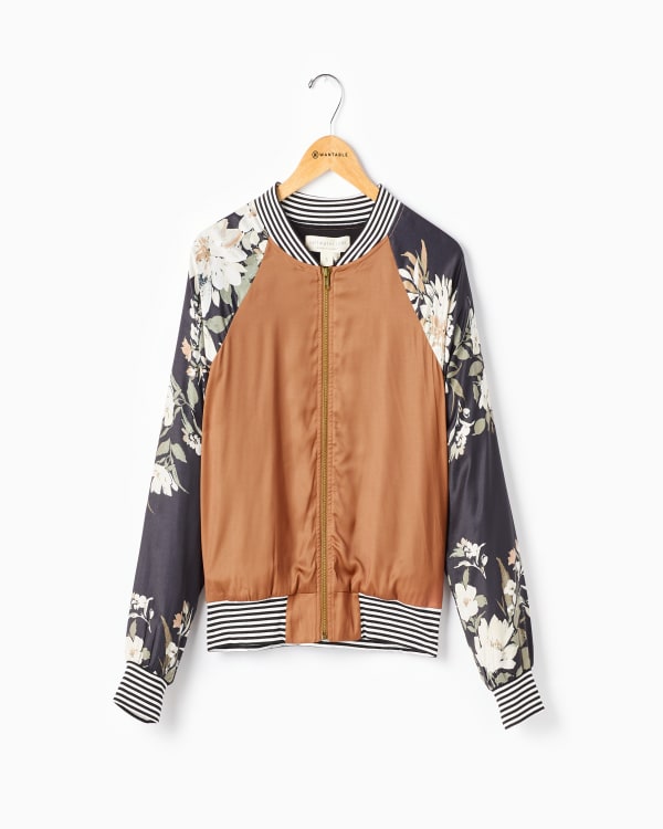Up your layering game! This mixed-print bomber jacket will elevate any ensemble. Instant luxe will be achieved whether you pair this with breezy wide-leg pants or high-rise denim. Order it now, get free shipping, and feel beautiful every time you wear it. 100% Polyester.