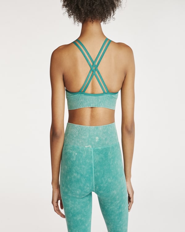 Seamlessly move from the gym without a wardrobe change in this low impact, strappy sports bra with removable bra cup pads. Featuring a stylish distressed fabric wash and ribbed bottom band, you'll have all your friends asking where you got your cute new workout gear.