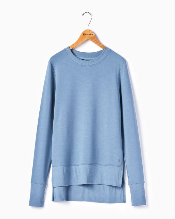 From stretch to savasana, this pullover will keep you cozy 24/7! Regular fit with a high-low hem, ribbed detailing, and side slits for a flattering bit of flow. Sustainably made and finished with a fleece lining that feels so soft to the touch.