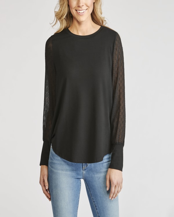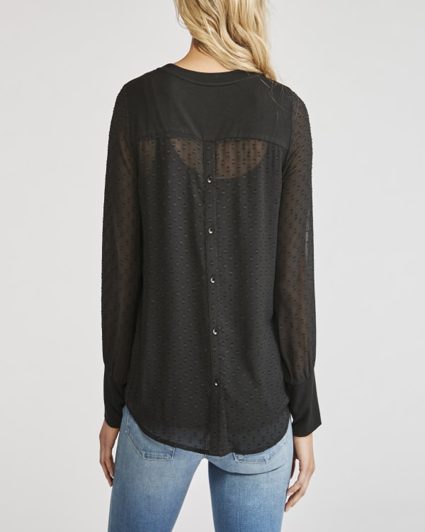 This gorgeous puff sleeve top will make you shine wherever you go. This relaxed fit top has a beautiful sheer back, sleeves and button-up detail in the back. Wear it with jeans and a pair of statement earrings for your next #ootd selfie.