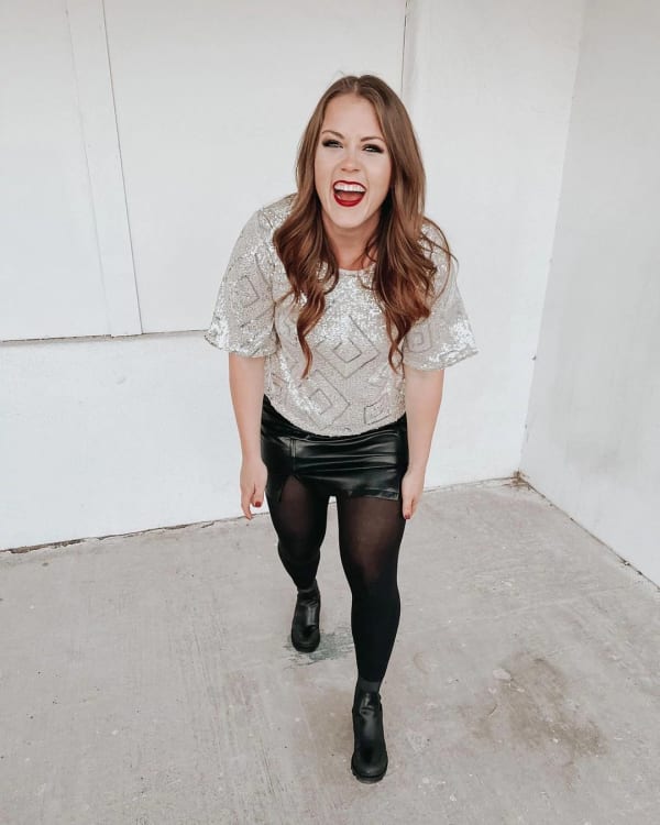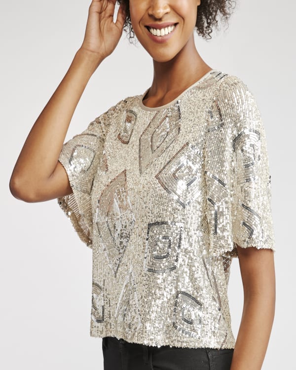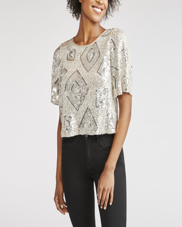 This sequin top will make you dazzle all party long! Boxy fit with an eye-catching diamond pattern and a built-in lining.