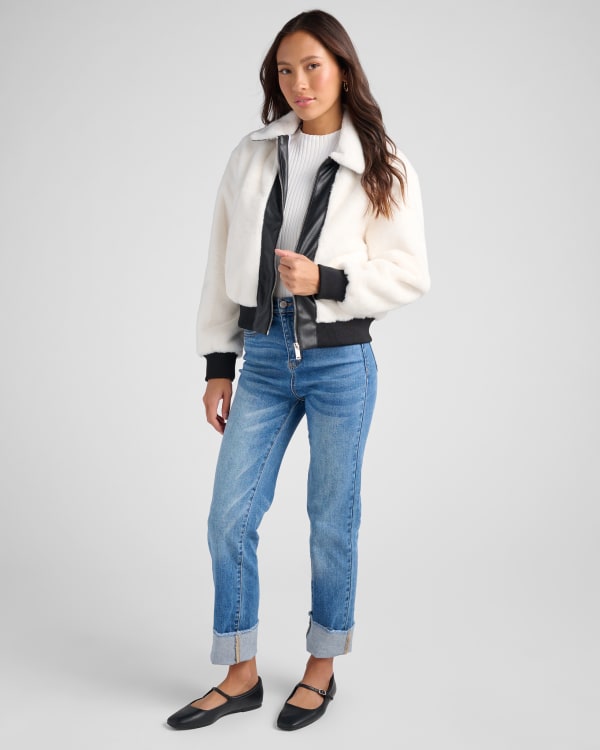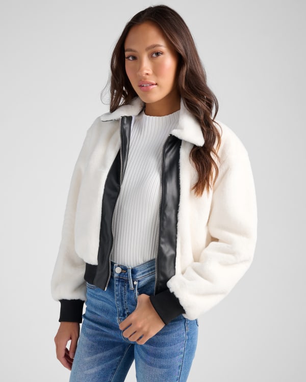 Elevate your cold-weather looks with this zip-up sherpa jacket. Boxy fit with the coziest collar, a zip-up front and faux leather details. Midweight and ready to layer over all your basics.