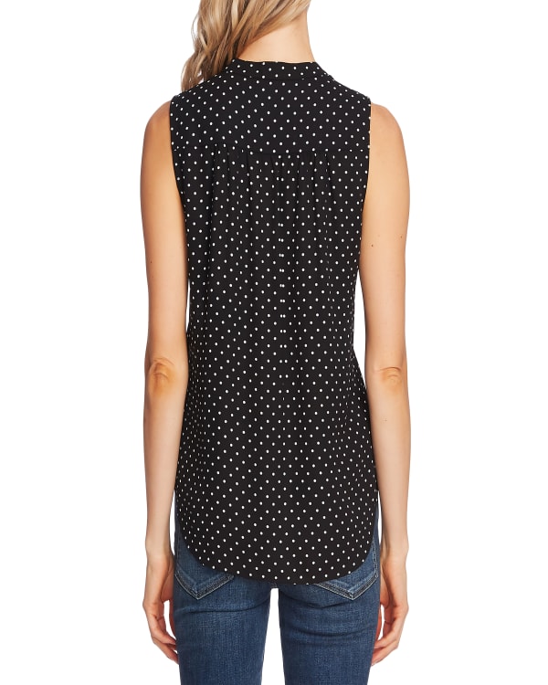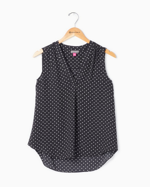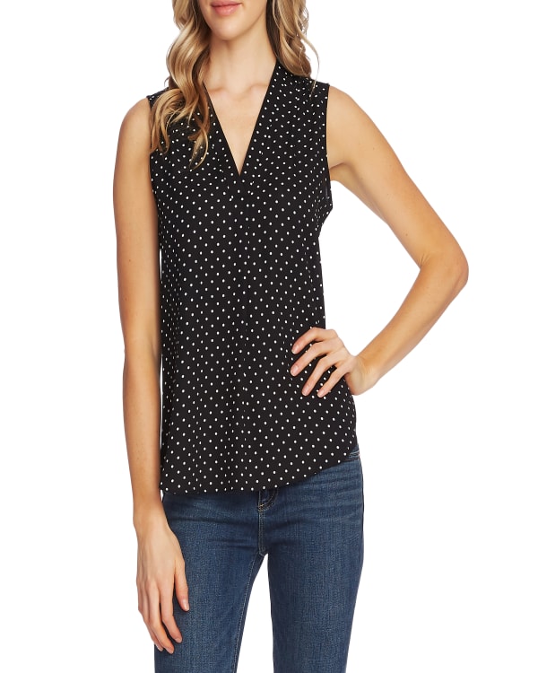 Featured in a best-selling fit from Vince Camuto, this sleeveless blouse features a classic black and white polka dot print, a sleek v-neck and a relaxed silhouette.