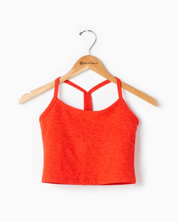 This tank may be cropped, but it’s definitely not short on style. Made from Beyond Yoga's incredibly soft spacedye performance fabric, featuring a shelf bra and skinny racerback strap design. Wear it with high waist leggings or layer it under your favorite draped tops. 87% polyester, 13% spandex, machine wash cold.