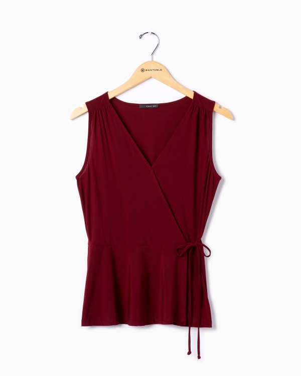 This sleeveless wrap top is an endlessly versatile layering piece. Regular fit with a flattering cinched waist, secure wrap front, side tie, and a flattering peplum. Made in the USA of a breathable rayon stretch.