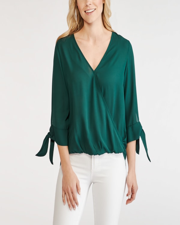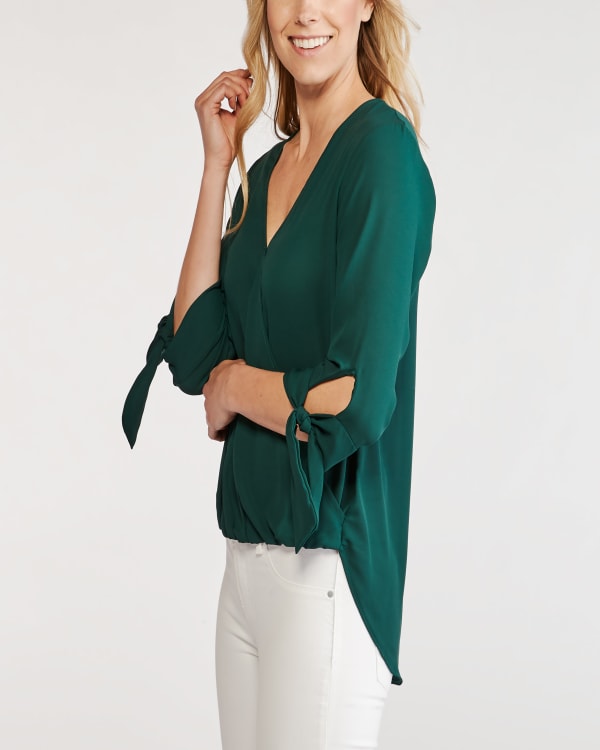 An essential for both your work and weekend wardrobe, this versatile blouse can easily be styled for every day of the week. Three-quarter length sleeves are detailed with a tie, while a surplice neckline and a high-low hem add the finishing touches.