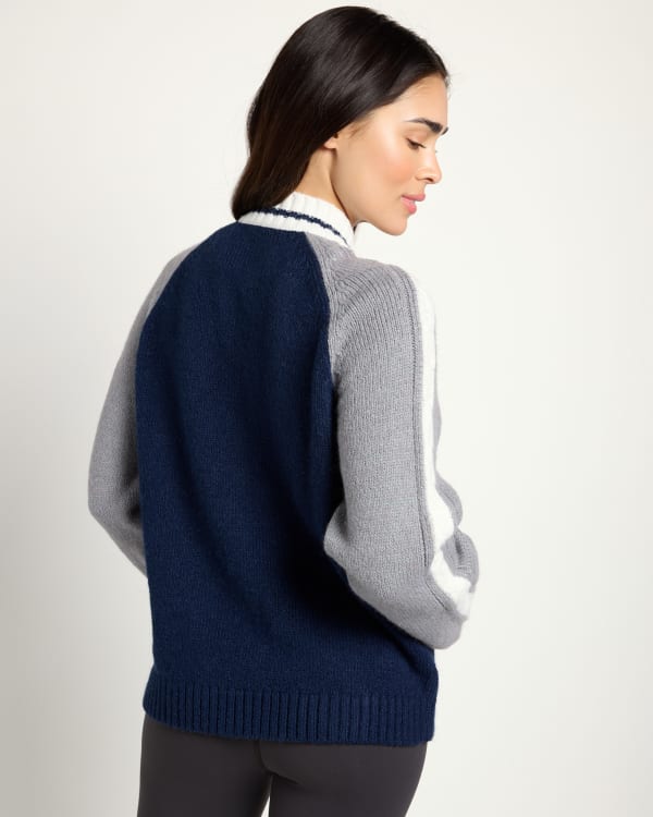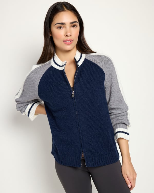 Sporty lines meet soft texture. Made from 100% cotton, this zip-front sweater nods to classic bomber styling with a taller ribbed collar and regular fit, while contrast cable knit stripes down the sleeves add subtle dimension. Finished with raglan colorblocking and a two-way zipper.