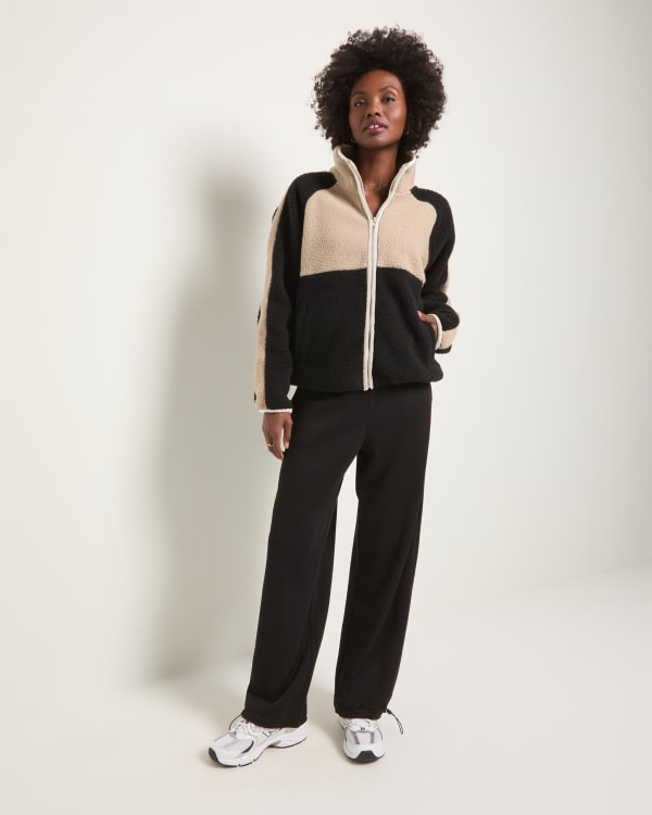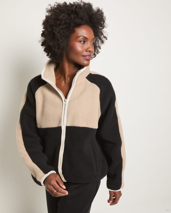 Soft, spirited, and made to layer. This zip-front jacket features a bold colorblock design, stand-up collar, and side pockets all in plush microfleece that feels like a wearable mood boost. Easy to throw on, hard to take off.