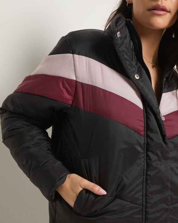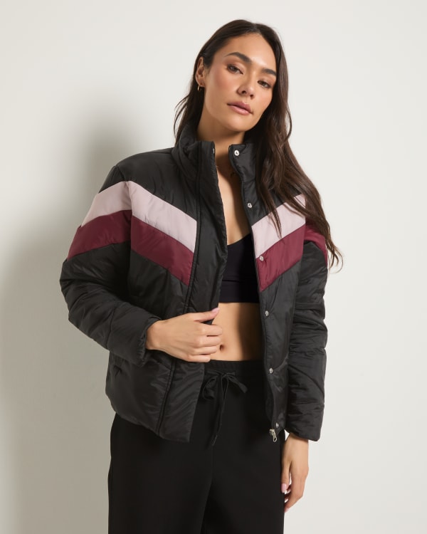 A little retro, a lot cozy. This snap-front puffer brings playful structure with bold colorblocking, a high collar, and curved seam details for a softly sculpted shape. Finished with pockets and plenty of warmth.