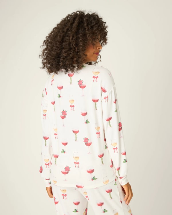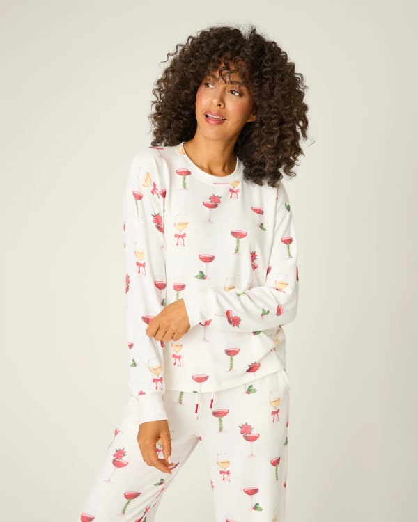 Shaken or stirred, comfort’s on the menu. This soft pajama top is the perfect mix of playful and cozy, featuring long sleeves with stretchy trims. Patterned with a holiday cocktail motif.