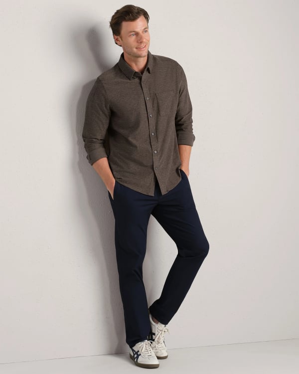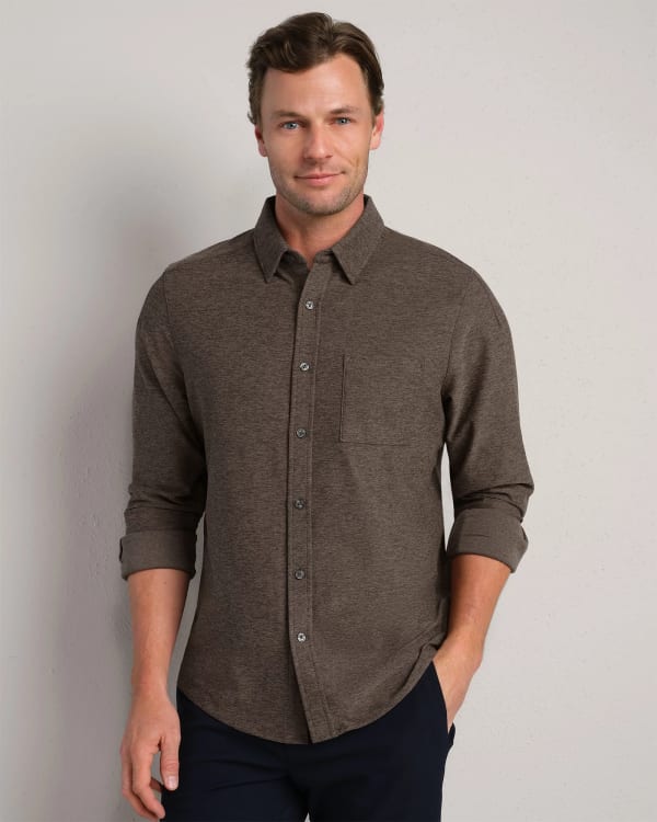 You may be working from home, but you'll feel office-ready in this long sleeve shirt! Boxy fit with a shirttail hem and button-up front. Made of a so-soft and stretchy brushed knit.