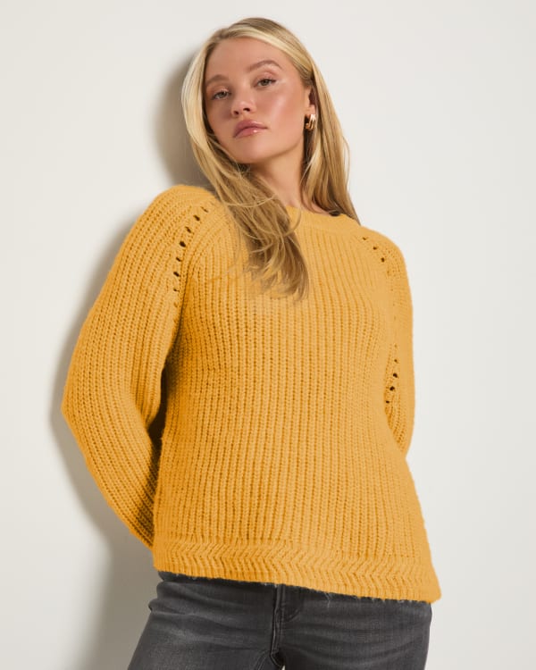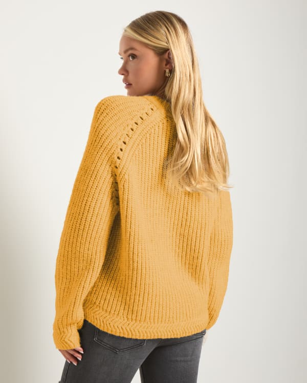 For sunset drives and stargazing stops. With raglan sleeves, a cozy texture, and chevron detail at the hem, this sweater’s got just enough western grit to ride along—and it’s made with recycled fibers, too.