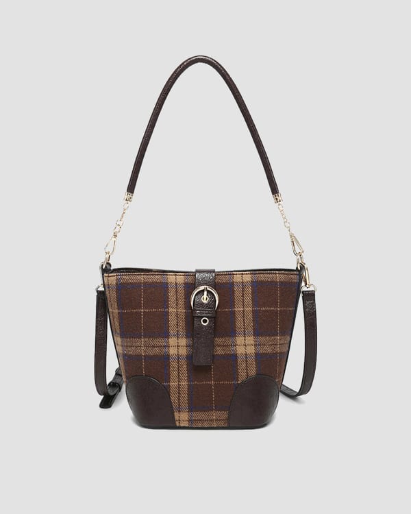 This bucket bag is a timeless treasure for your collection! So chic and easy to style with a sturdy profile, top-zip and buckle closure, and detachable shoulder and cross-body straps. Crafted from a plaid fabric material with faux leather accents.