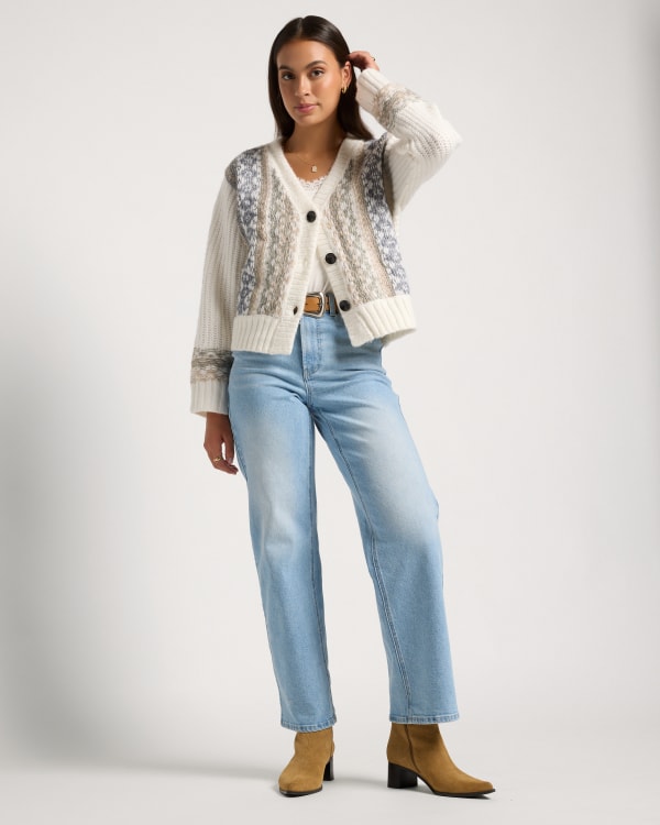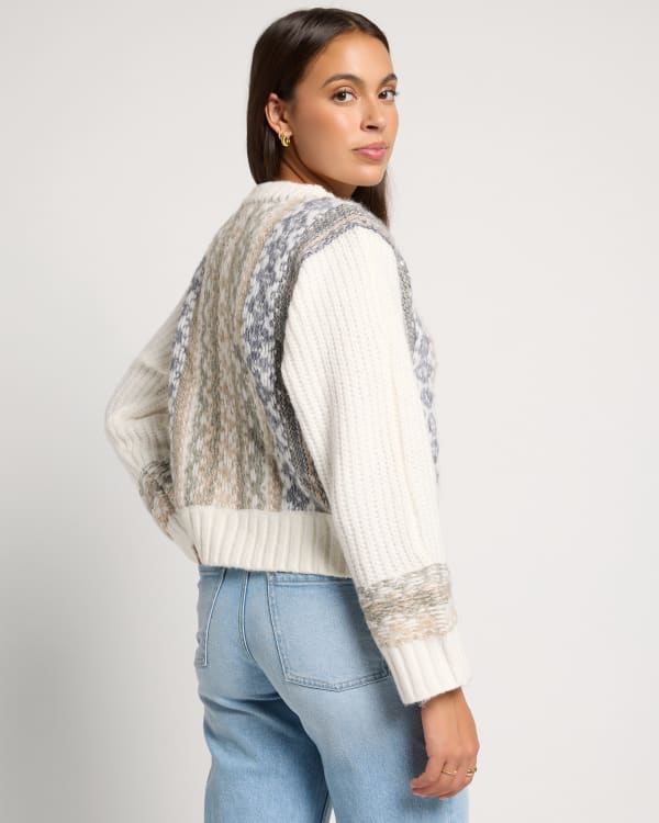 This button-up cardigan was made for cool desert nights and coffee on the porch. With a rugged palette that reads like worn-in denim and sand, plus heritage patterning and recycled yarn, it’s the kind of layer that says “I’ve been places”—even if it’s just the local farmers market.