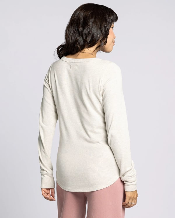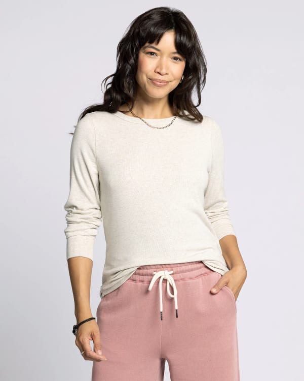 This long sleeve top will be your basic bestie! Relaxed feminine cut with a boat neck and curved hem. So-soft and stretchy in a ribbed knit that easily layers under your favorite outerwear.
