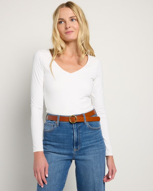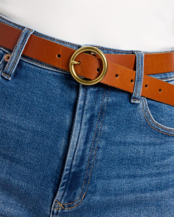 Finish your look with this genuine leather belt! It features a 1-inch slim profile that fastens with a gold-tone ring buckle. Made of a 100% genuine leather in a classic tan color. Size Guide: XS: 1st hole 24", last hole 30" | S: 1st hole 28", last hole 34" | M: 1st hole 32", last hole 38" | L: 1st hole 35", last hole 41" | XL: 1st hole 38", last hole 44"