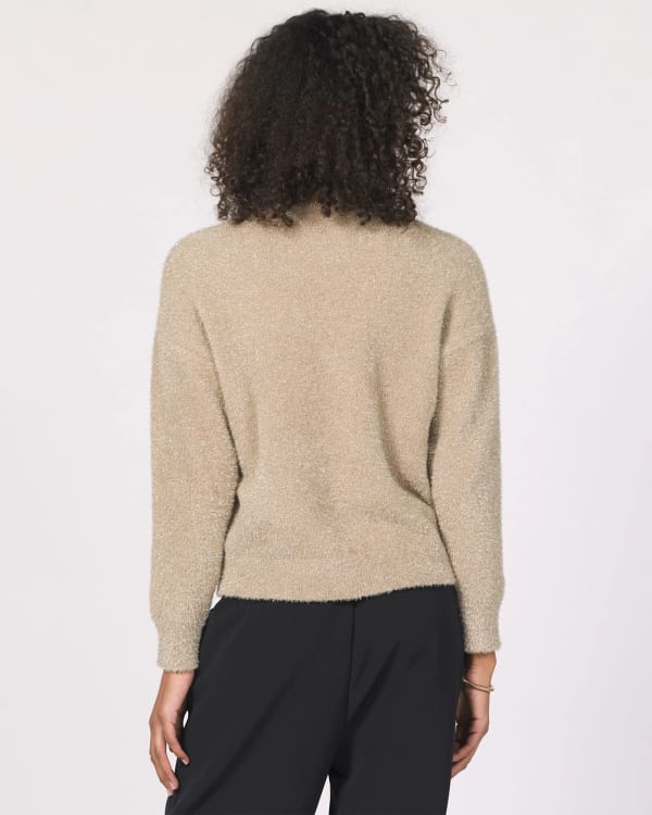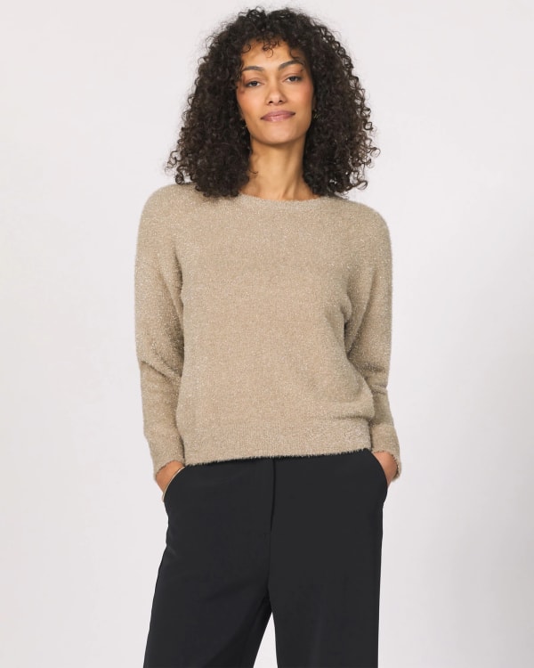 A touch of shimmer goes a long way. This soft, relaxed sweater is woven with metallic threads for a gentle sparkle that catches the light with every move. Cozy enough for daytime, polished enough for evenings out.