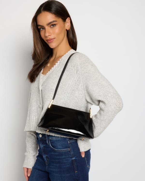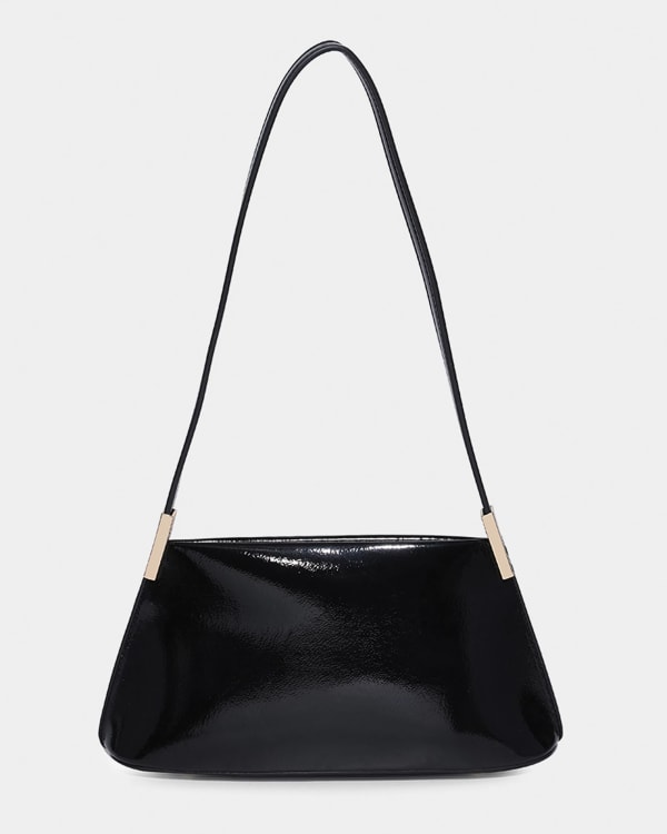 Sleek and chic, this shoulder bag is the modern finishing piece your outfit needs! It has slender straps, a snap closure, and a minimalist shape that can fit your essentials — keys, phone, cards, and small cosmetics. Made of a glossy vegan leather that's easy to wipe clean.