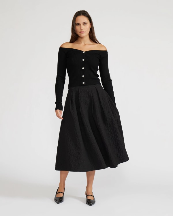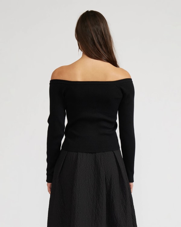 Simple, sleek and seriously flattering. Made of a merino blend, this off-shoulder top features a button-front closure and an elegantly contoured neckline. Team it with a skirt for a stunning ladylike look that gets it right for date night.