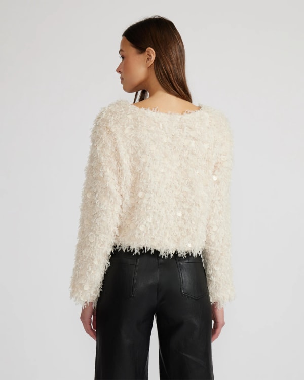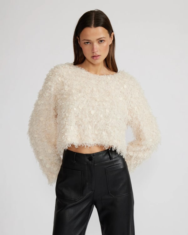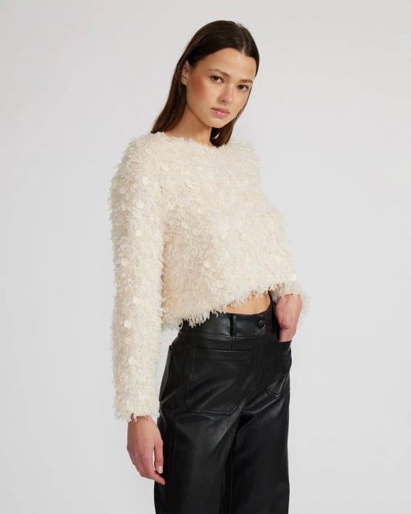 When comfort meets a little couture. This plush, feathered sweater feels like a warm hug but looks runway-ready thanks to its eye-catching texture. Soft, glam and guaranteed to turn heads.