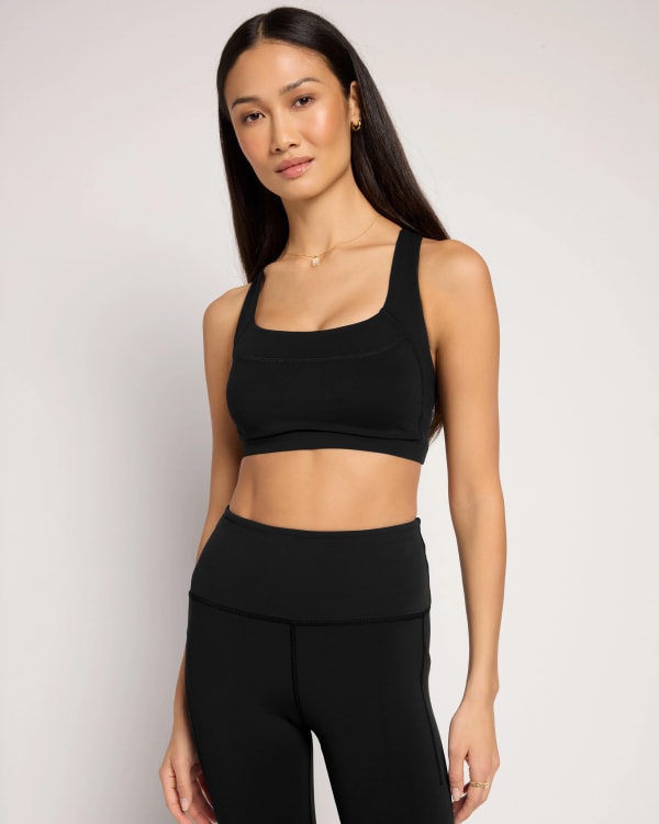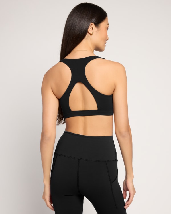 With quick-drying technology and an open mesh mirroring the skeletal structure of the human body, this sports bra is so fun to show off your favorite strappy tops! Avoids uniboob with removable padding and racerback straps. Made responsibly in the USA of a so-soft and silky 4-way stretch knit.