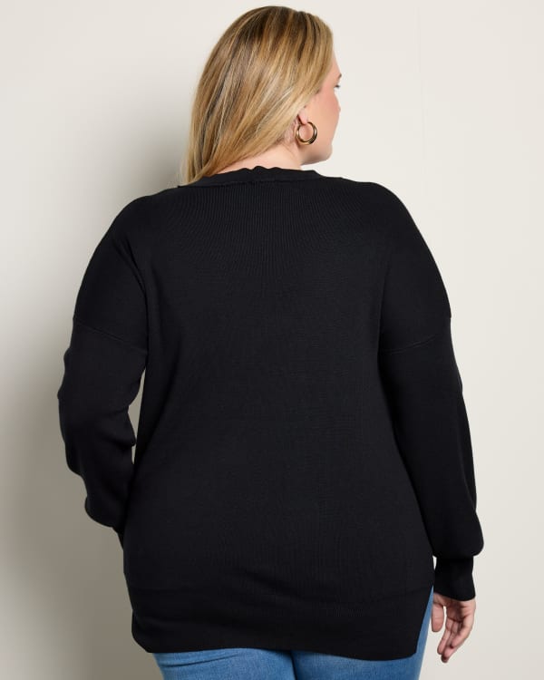 Celebrate in style with this oversized graphic sweatshirt. It's tunic length, warm and perfect for making a statement on chilly days or at casual parties. Made of a stretchy-soft knit with side slits and "CHEERS" woven across the front.