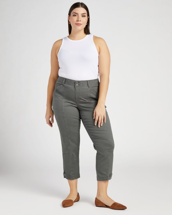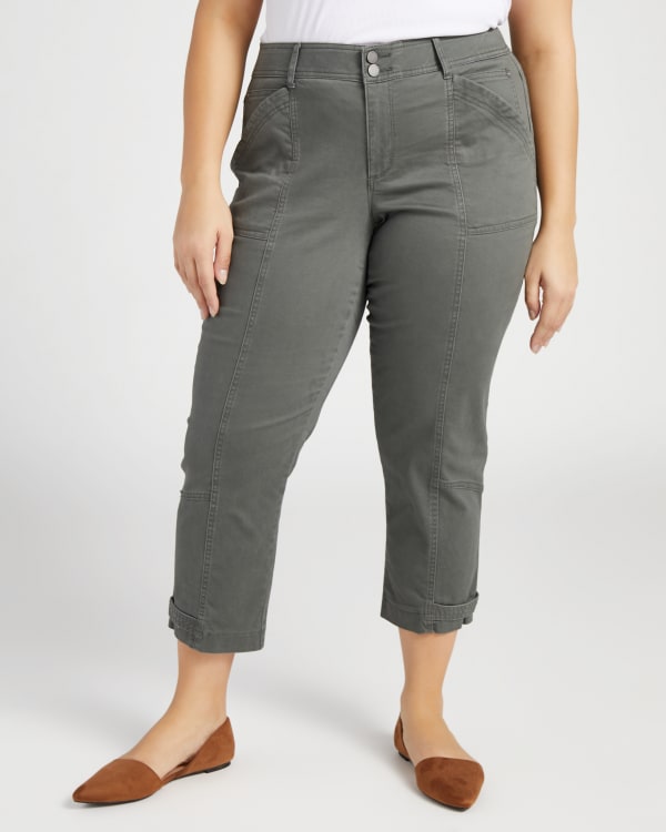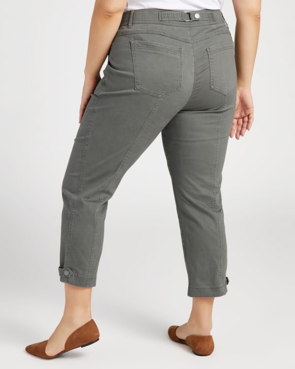 You'll command attention in these high-waisted utility pants! Regular fit and ankle-length with six pockets, a zip fly with double button closure and snap details at the ankles and back. Made of sturdy cotton with the perfect stretch.