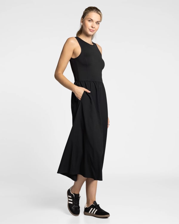 Step into everyday ease with this sleeveless midi dress! Fitted with pockets, an elastic waist and soft skirt in an A-line silhouette. Made of a so-soft knit with tons of comfy stretch.