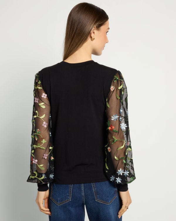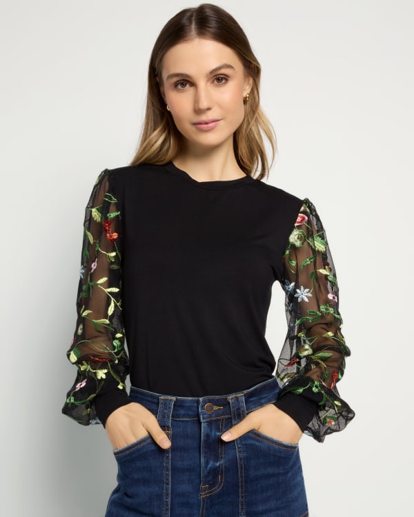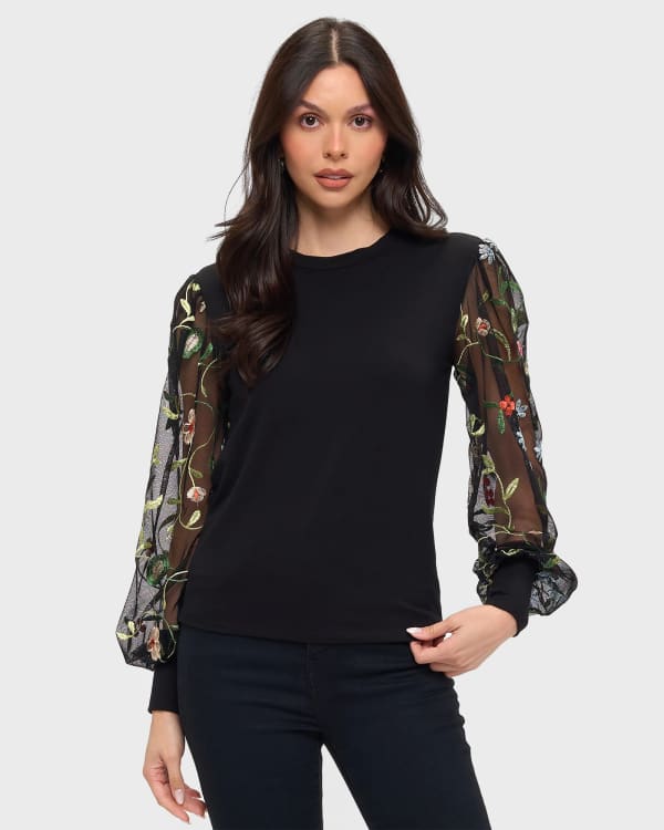 Sweet meets sophisticated. This blouse brings a touch of romance to your collection with sheer mesh sleeves embroidered with colorful florals. Crafted from a soft, stretchy knit, it’s the easy answer for a full day of special occasions — think brunch, high tea and beyond.