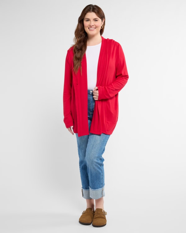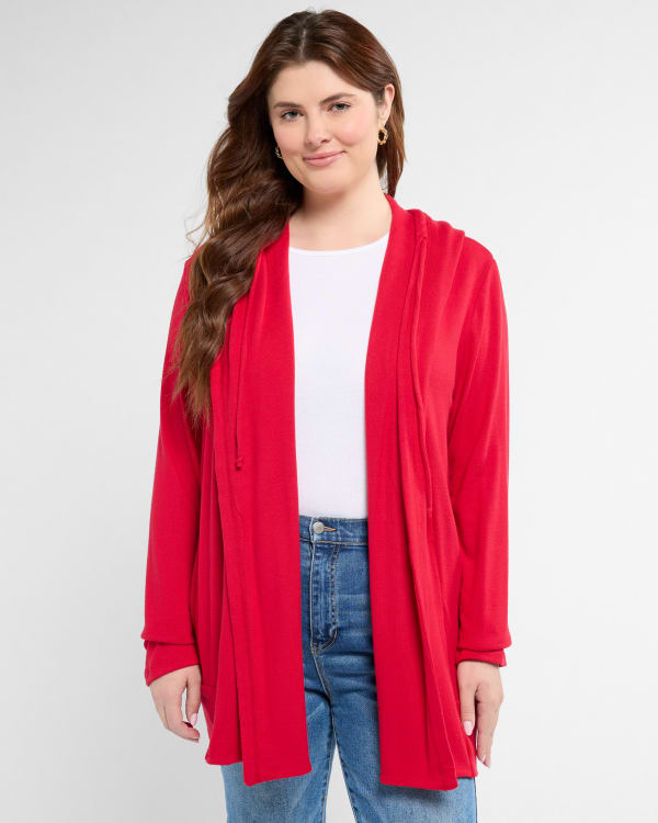 Your new favorite go-to cardigan. With its relaxed fit, breezy open front and drawstring hood, this cozy layer is perfect for easy days and laid-back nights. Made from an ultra-soft brushed fabric, complete with functional pockets.
