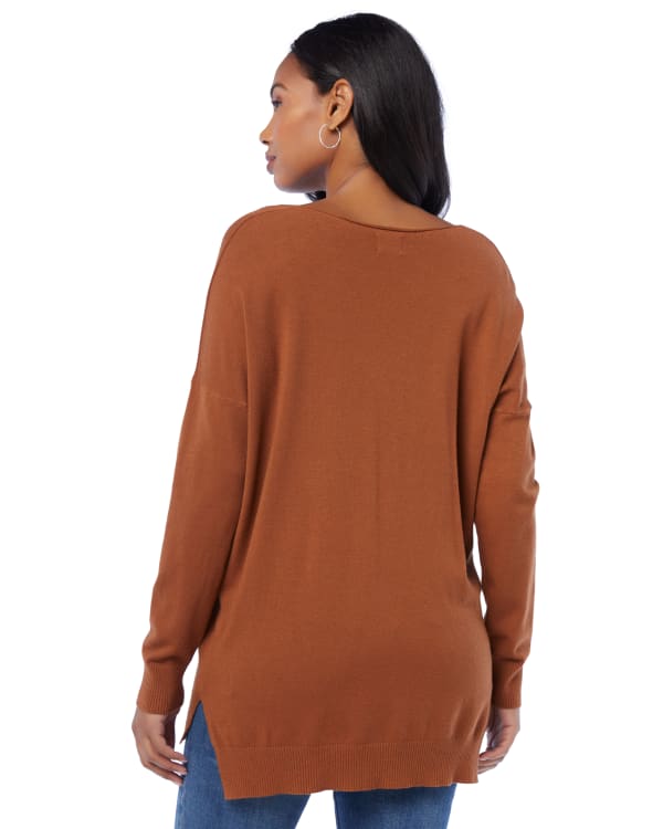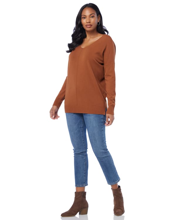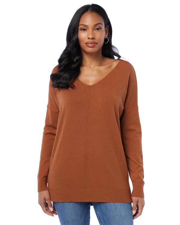 This is the oversized sweater your on-trend style requires! Tunic length with a flattering high-low hem, dropped sleeves, and a center seam. Made of a medium-weight brushed knit that feels so soft to the touch.