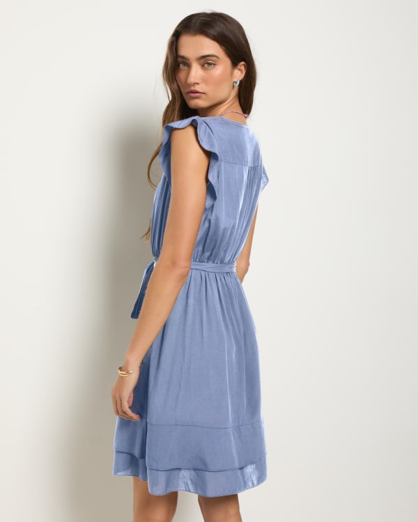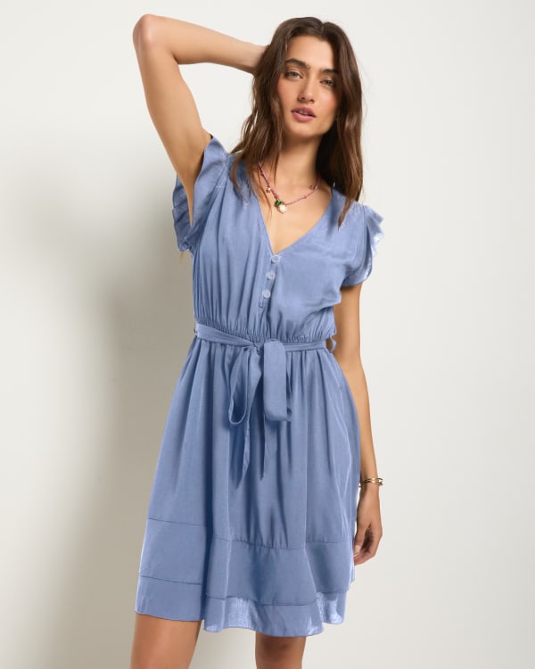 Playful, effortless, and made to flatter. This fit-and-flare dress features ruffled cap sleeves, a buttoned V-neck, and a self-tie belt for a perfectly cinched waist. A tiered ruffle hem adds movement, while the lightweight rayon fabric keeps it breezy and comfortable from day to night.