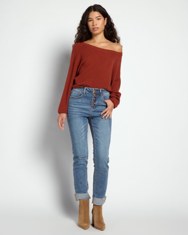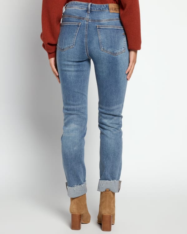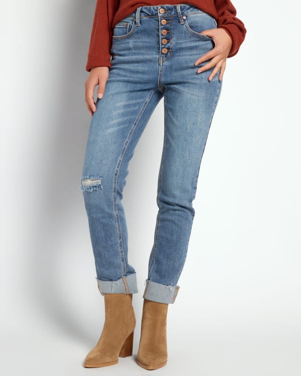Our high-rise mom jeans have an easy fit and a soft, broken-in feel. Ankle-length with a raw, cuffed hem and a five-button fly. Made from soft stretch denim for travel days or weekends away.